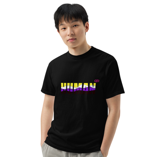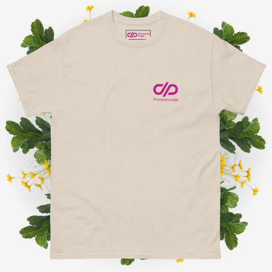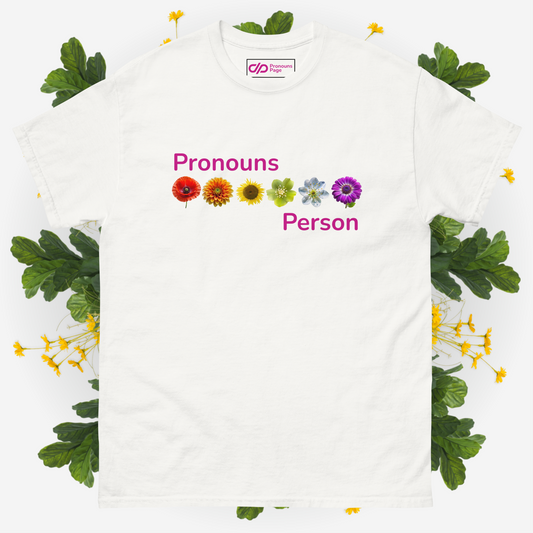 Natural Pride collection "Pronouns Person" rainbow floral strip t-shirt